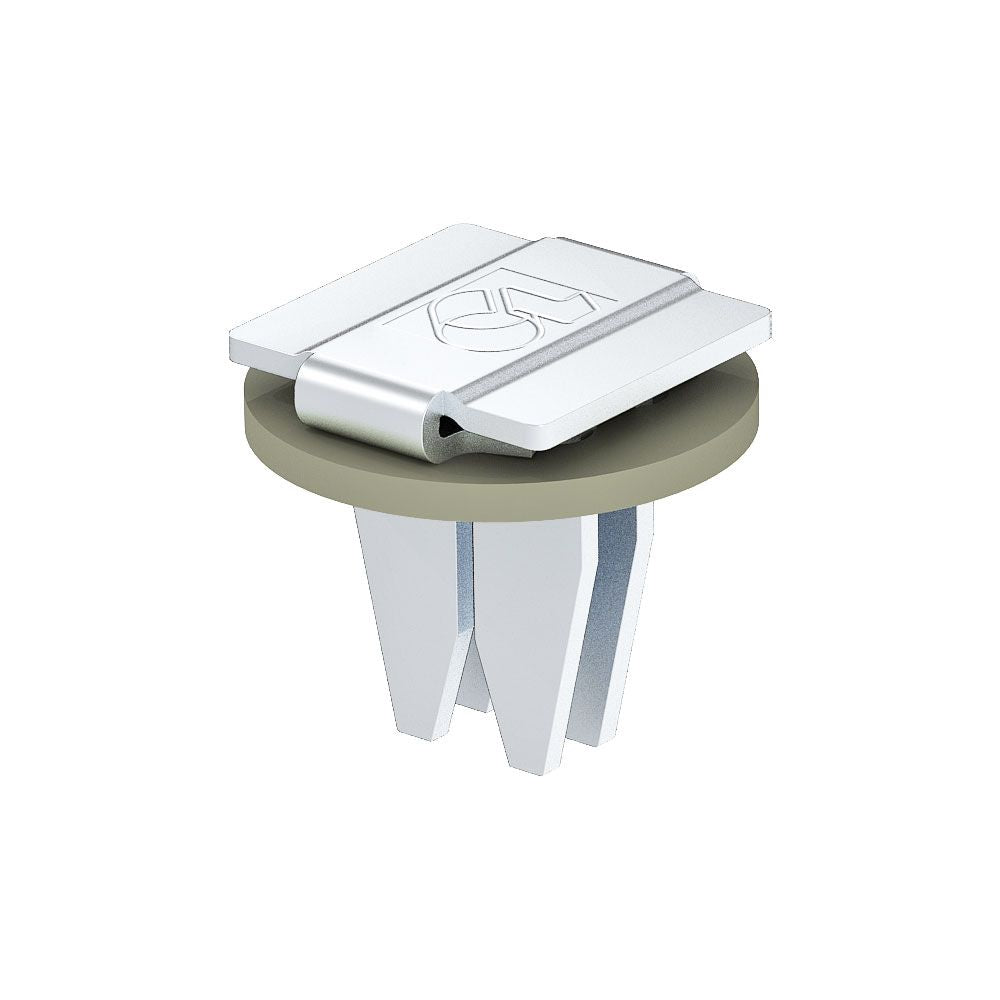 Esim. säleen kiinnitys kehykseen. Kiinnike lyödään reiästä säleen päätyyn, lukittuen lujasti sekä säleeseen että kiinnittyen samalla laipastaan tiiviisti kehykseen. Tiivistelevy on esiasennettu mikä nopeuttaa asennustyötä.