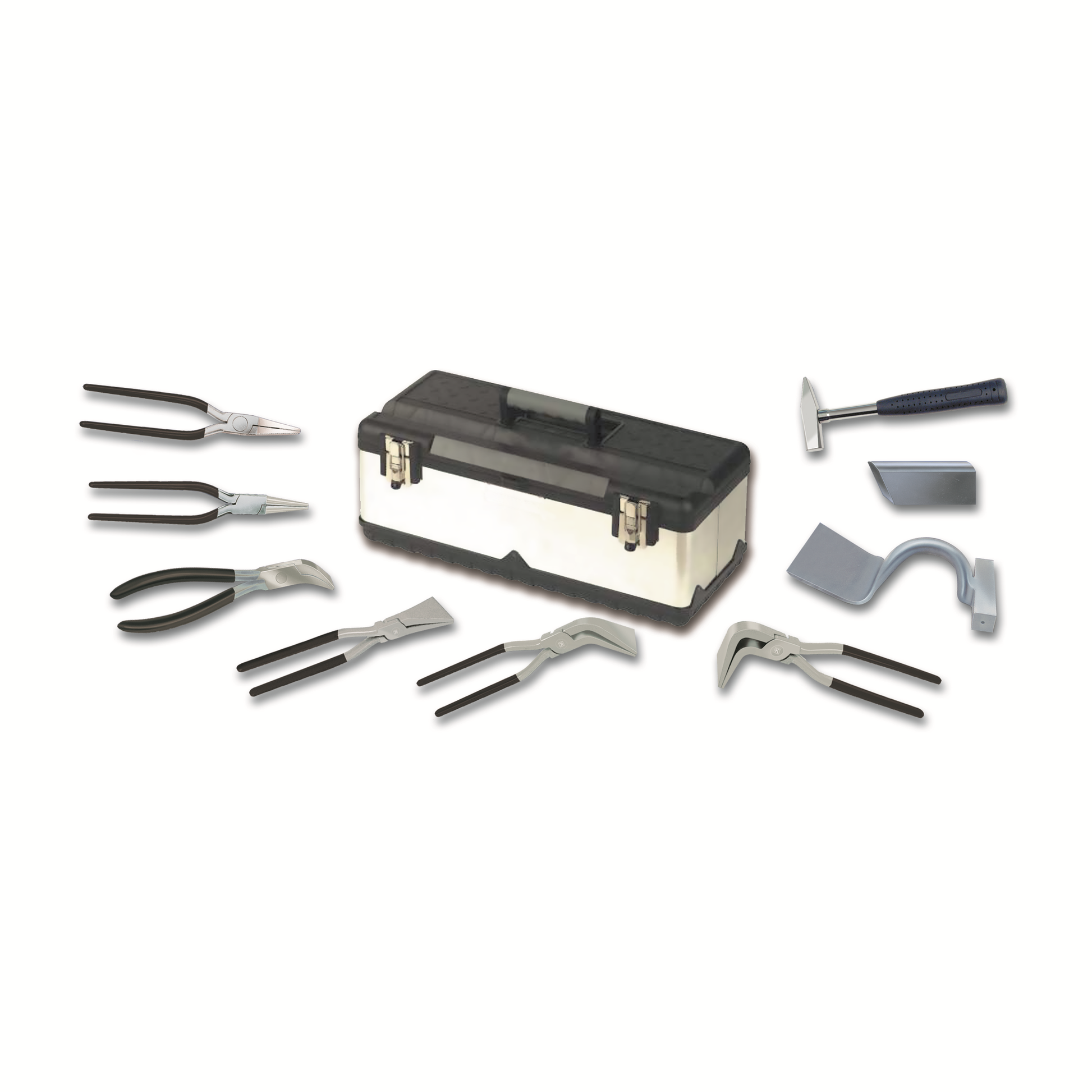 Ruostumattomasta teräksestä valmistettu työkalusetti peltisepälle